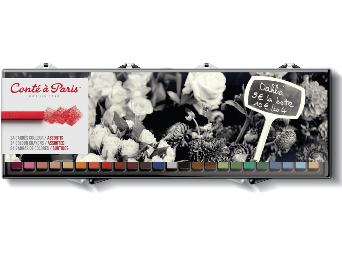Conté pastelkrijt is een hardere kwijtsoort. Het zijn harde vierkante geslepen staafjes. Krachtig van kleur, en goed te combineren met bijvoorbeeld Rembrandt Pastelkrijt of Sennelier Pastelkrijt. Je kunt bijvoorbeeld een droge tekening maken met de Conté, en dan een vettigere laag er overheen tekenen met Oliepastel. Deze set bevat verschillende kleuren, wit, geel, oranje, roze, rood, lichtgroen, donkergroen, lichtblauw, donkerblauw, lichtbrtuin, donkernruin en zwart.