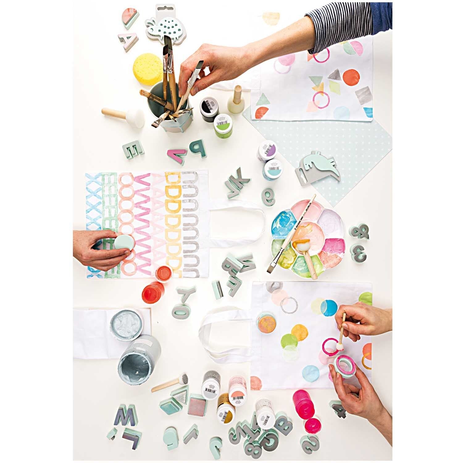 Foamstempels zijn de ideale beginnerstempels, zelfs voor kinderen! Ze zijn gemakkelijk te gebruiken op papier, karton, hout, stof, spieraam, muren, enz. en zijn gemaakt van zacht, flexibel foam, waardoor ze zich goed aanpassen aan de ondergrond. De achterkant van de stempel is gemaakt van hard foam voor een gelijkmatige afdruk. Afhankelijk van de ondergrond kunt u stempelen met stempelkussens, acrylverf (bij voorkeur aangebracht met een inktroller) of textielverf (ook met een inktroller).