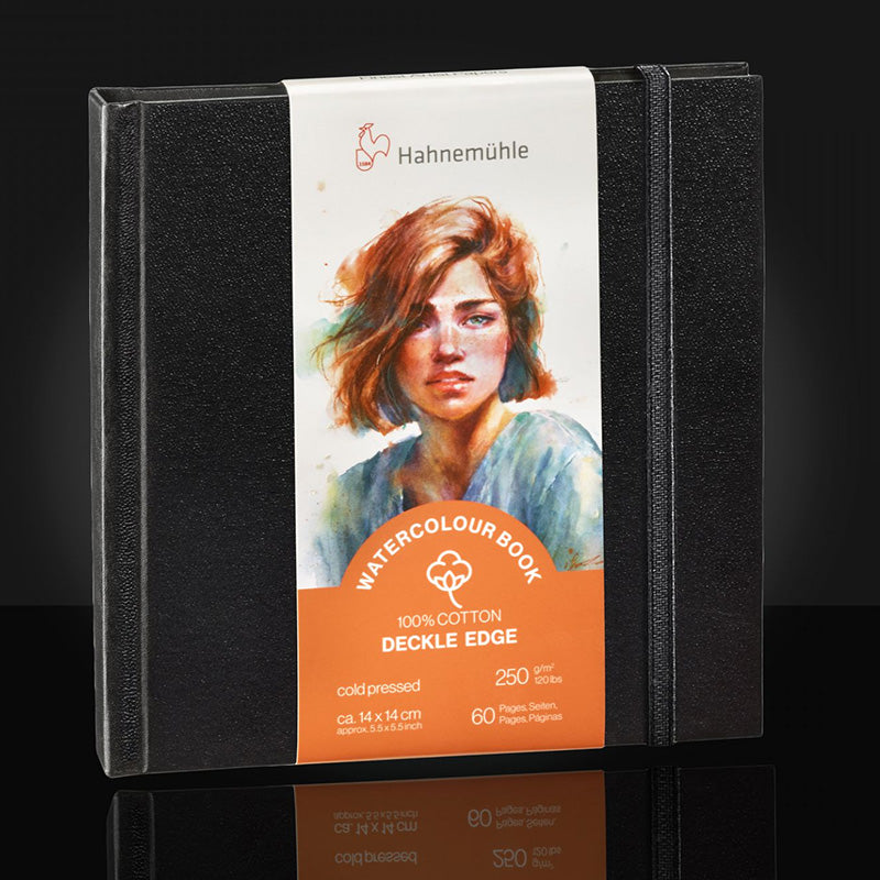 Dummy schetsboek (14x14 cm) 60 vel, 250 grams, cold pressed, 100% katoen. Hahnemuhle gebonden Dummies zijn van goede kwaliteit met een harde zwarte kaft, leer-look. Het papier in deze dummie heeft een driezijdige, handgescheurde rand, wat een natuurlijke uitstraling geeft. De natuurlijke textuur van het papier biedt een mooi oppervlak voor zowel subtiele, gedetaileerde als grovere, brede penseelstreken.