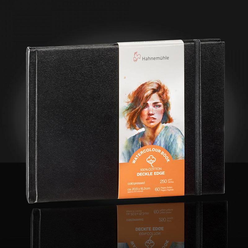 Dummy schetsboek Landschap (15,3 x 10,3 cm) 60 vel, 250 grams, cold pressed, 100% katoen. Hahnemuhle gebonden Dummies zijn van goede kwaliteit met een harde zwarte kaft, leer-look. Het papier in deze dummie heeft een driezijdige, handgescheurde rand, wat een natuurlijke uitstraling geeft. De natuurlijke textuur van het papier biedt een mooi oppervlak voor zowel subtiele, gedetaileerde als grovere, brede penseelstreken.